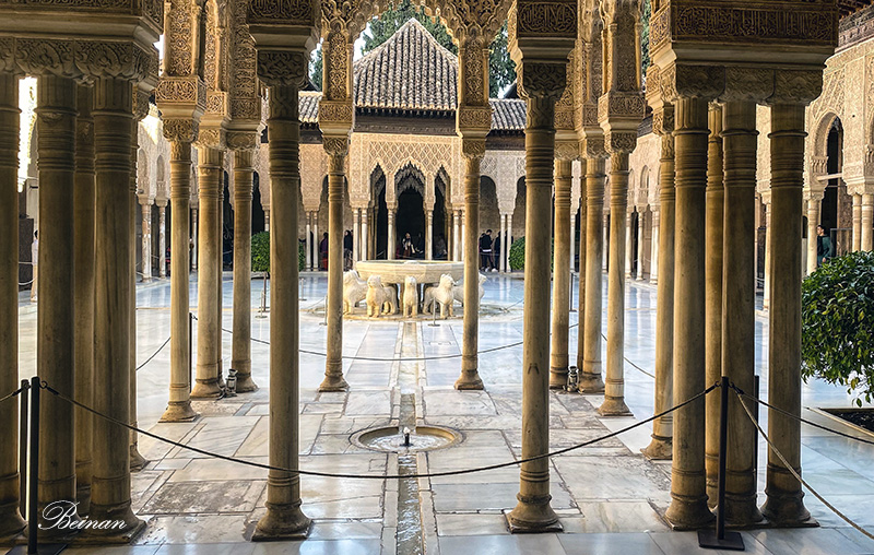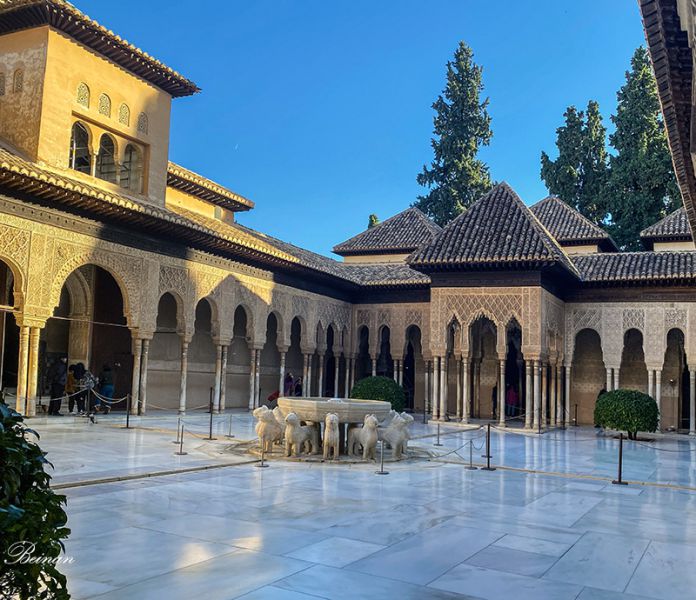狮子庭院(Patio de los Leones)也许是阿尔罕布拉宫最著名的地方。这个长28米、宽16米的长方形庭院是由穆罕默德五世下令建造的。周围是基督教修道院形式的围廊,由124根白色大理石柱支撑。
