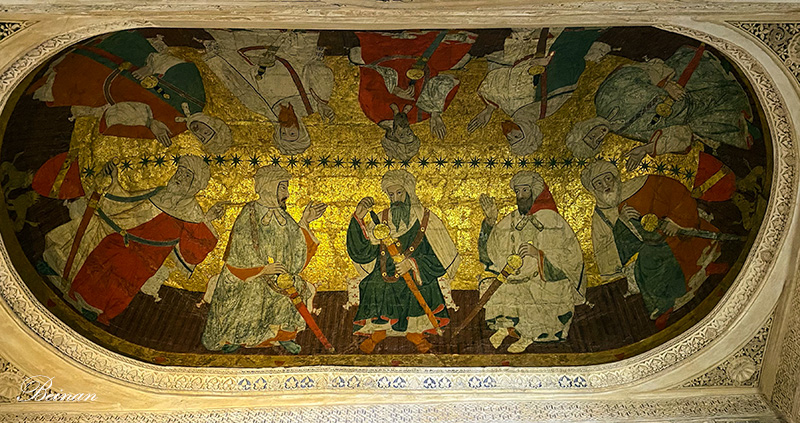 国王厅(Sala del Rey)是举办大型宴会的地方。大厅的墙壁上和顶棚有许多画在皮革上的画像。最著名的就是天花板上的这一幅,据说描绘的是王朝历代的十位国王像。至于它出自谁的手笔,还不得而知。