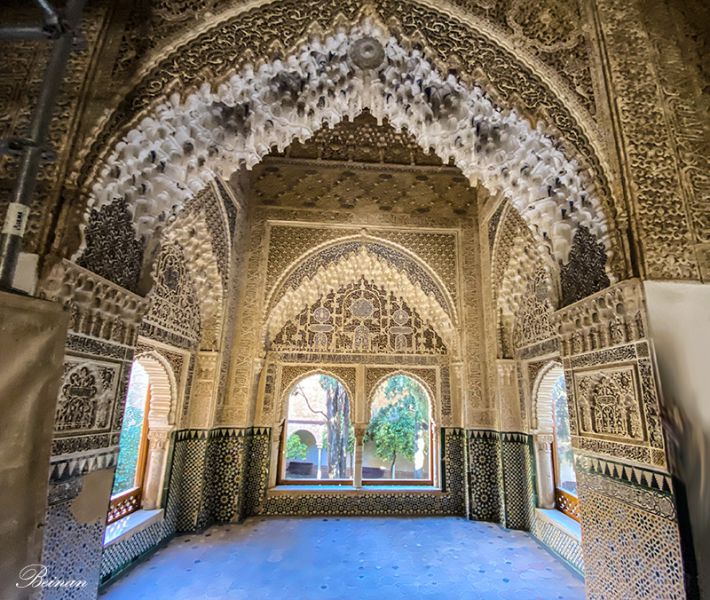 两姐妹厅(Sala de las Dos Hermanas)的设计和装饰更为惊艳。窗框门框上的雕饰令人想起钟乳石,又像是深海中的贝壳或珊瑚。