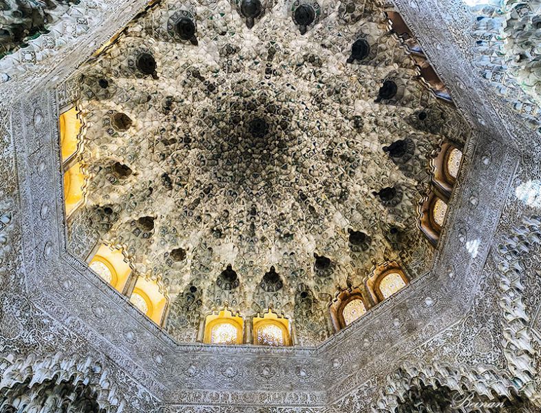 穹顶上的形如钟乳石的装饰是两姐妹厅的精华。钟乳石穹顶的中心是星星。抬头仰望,好像看到了一个巨大的闪着亮光的雪花。