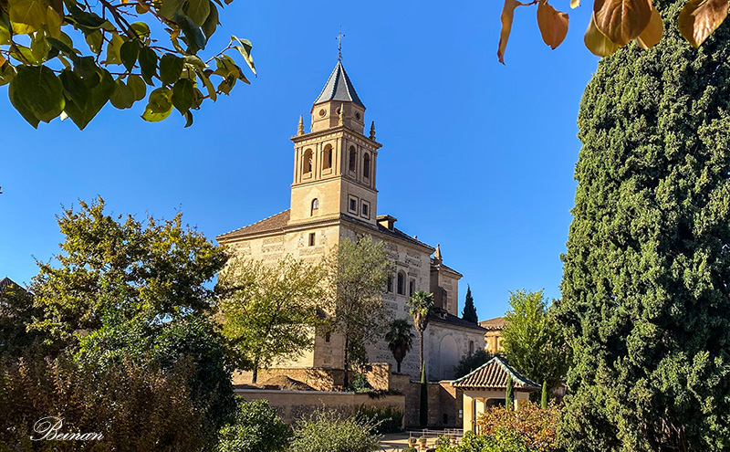在天主教君主占领格拉纳达后,他们于17世纪在原来的大清真寺的旧址上建造了一座天主教堂 -- 圣玛丽亚阿尔罕布拉教堂(The Church of Santa María de la Alhambra)。看起来和整个皇宫有点格格不入。