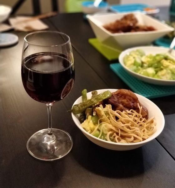 还有昨天小小阿立嫂烧的油爆青椒,华人超市买的烤鸡。