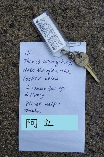 走回家,写张便条,连同错误钥匙,放回到我的信箱: