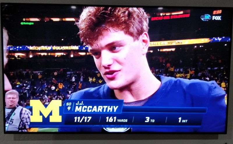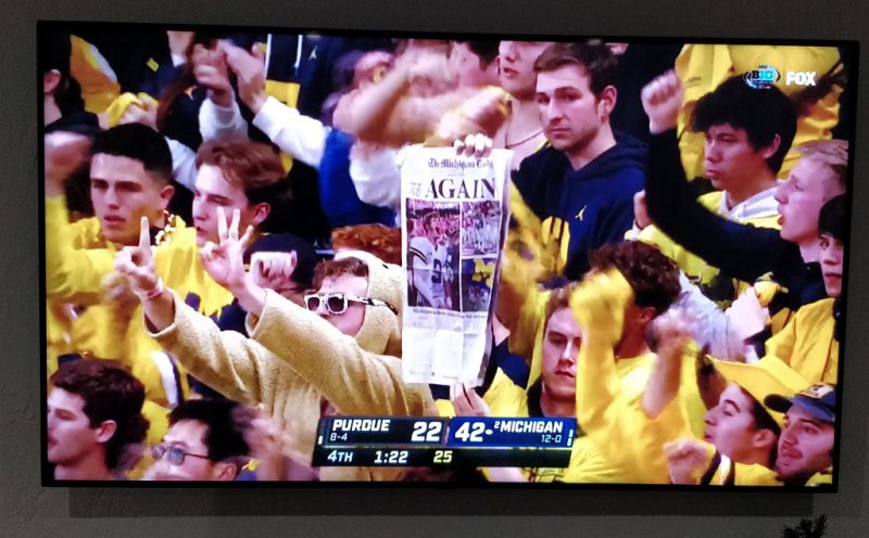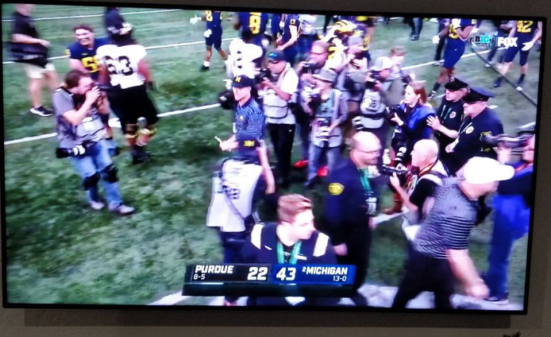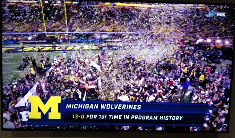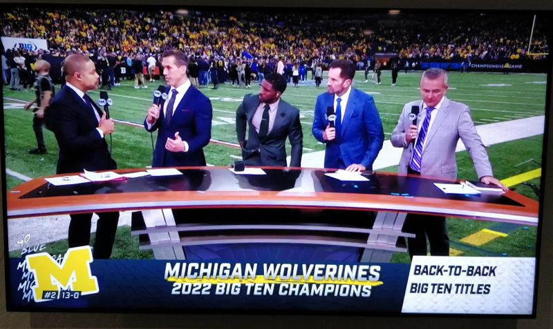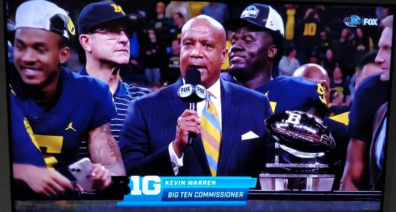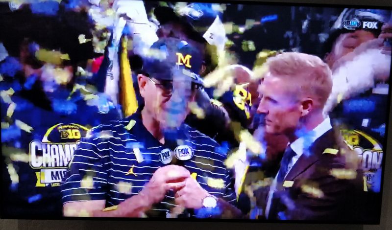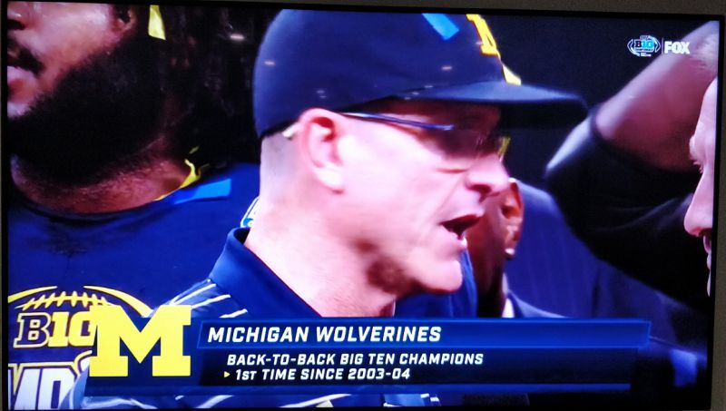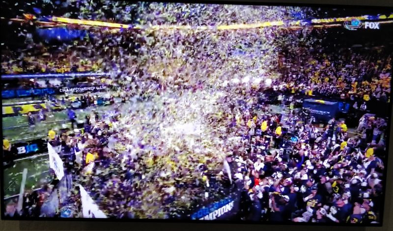 晚上橄榄球季后赛,大十冠军赛(Big Ten Championship):东区冠军蜜大金刚狼(University of Michigan Wolverines)对阵西区冠军普渡大学锅炉工(University of Purdue Boilermakers)。