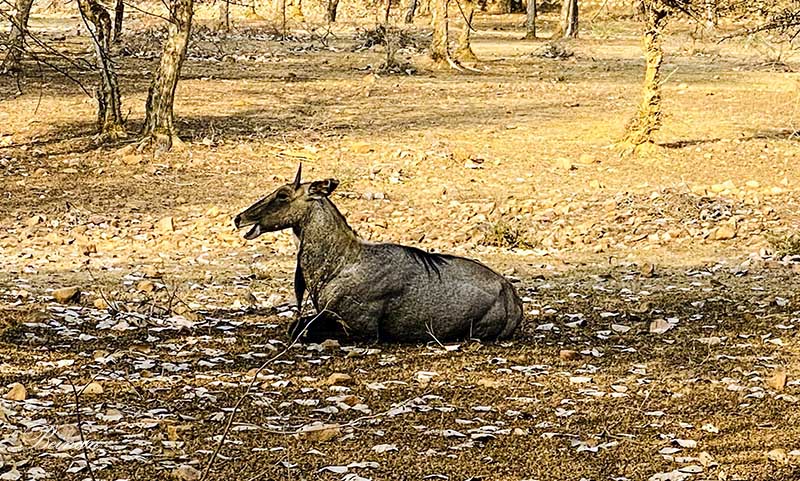 一只蓝牛羚(学名:Boselaphus tragocamelus;英文:Nilgai或Blue Bull)在草地上懒洋洋地趴着。我们的车离它很近,它都懒得动一下。