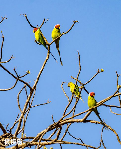 在这里看到的最漂亮的也是最多的鸟就是梅头鹦鹉(学名:Psittacula Cyanocephala;英文:Plum-headed Parakeet)了。它们紫红色的头部与绿色的身体和尾巴形成鲜明对比。真是美艳极了。