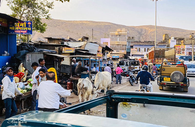 在伦腾波尔国家公园追踪野生动物时,导游告诉我们,那些鹿啊、羊啊都是老虎的食物。王大明白开玩笑的说,大街上那么多牛,为什么不抓来喂老虎啊?