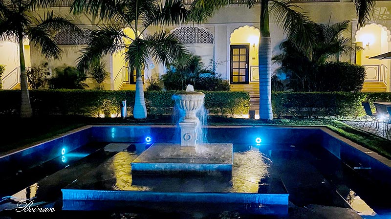 中心的庭院有一个喷泉。夜晚,喷泉潺潺,池水波澜,在灯光的照耀下显得格外妖娆。