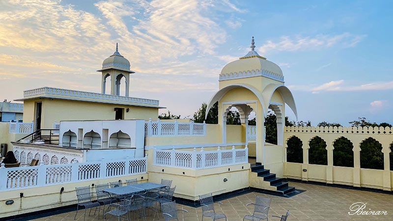 酒店的顶层是个巨大的露台,有着拉贾斯坦风格的塔楼,围栏,和景窗。
