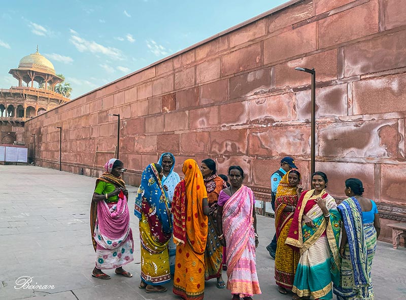泰姬陵入口的安检非常严格。男女有不同通道,背包里除了水以外,吃的东西包括水果、零食等一律不许带入。