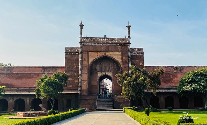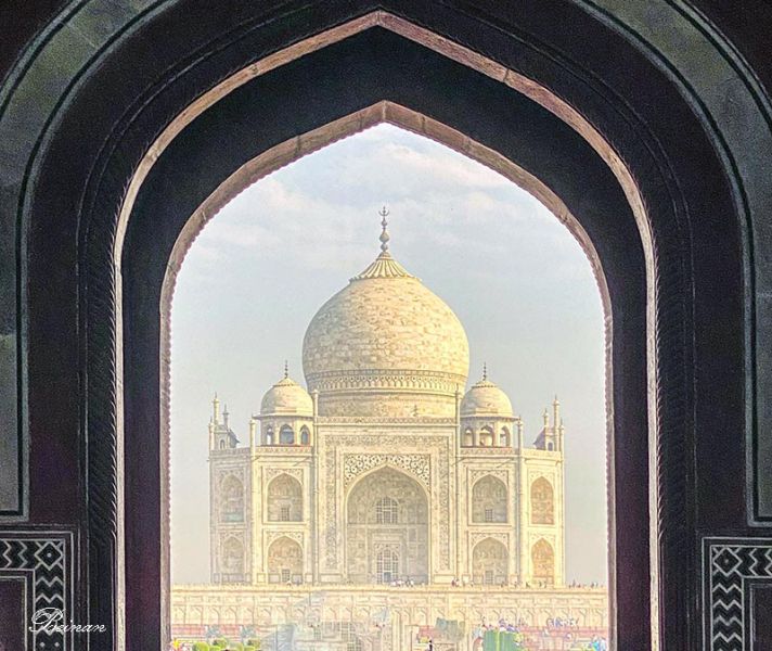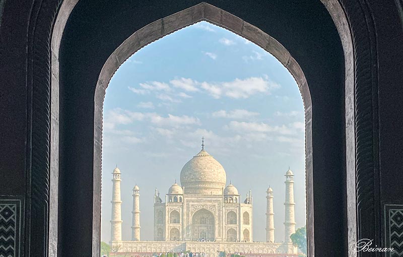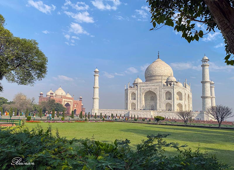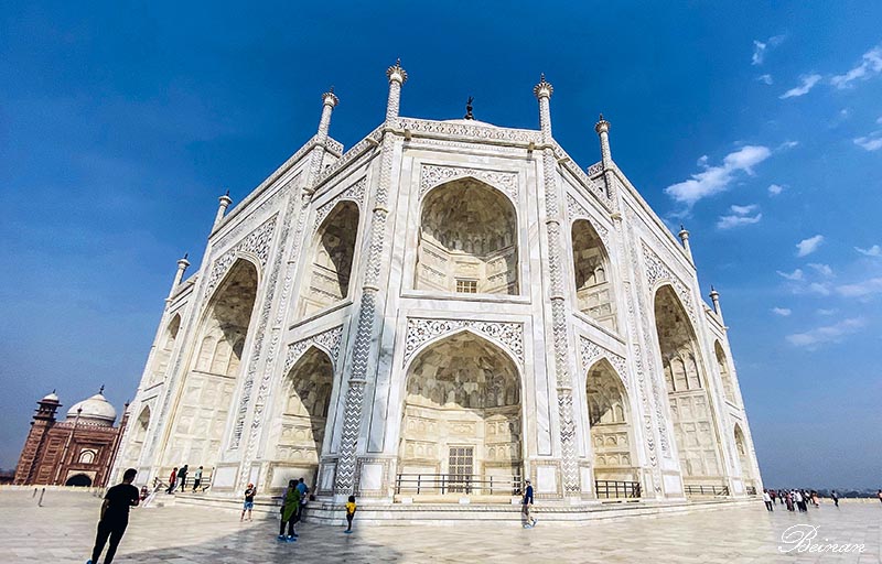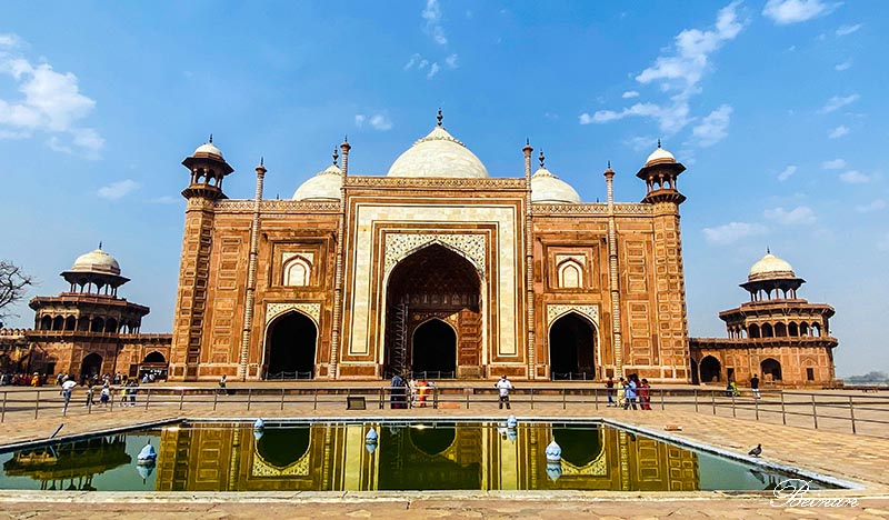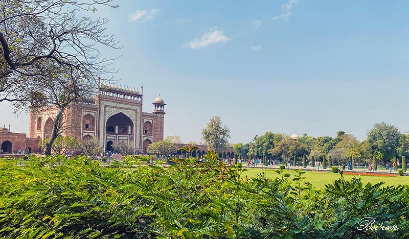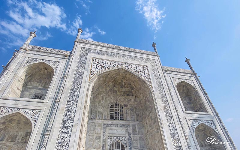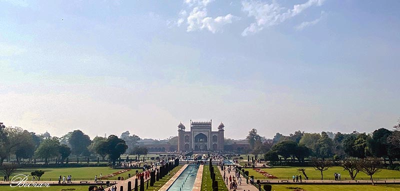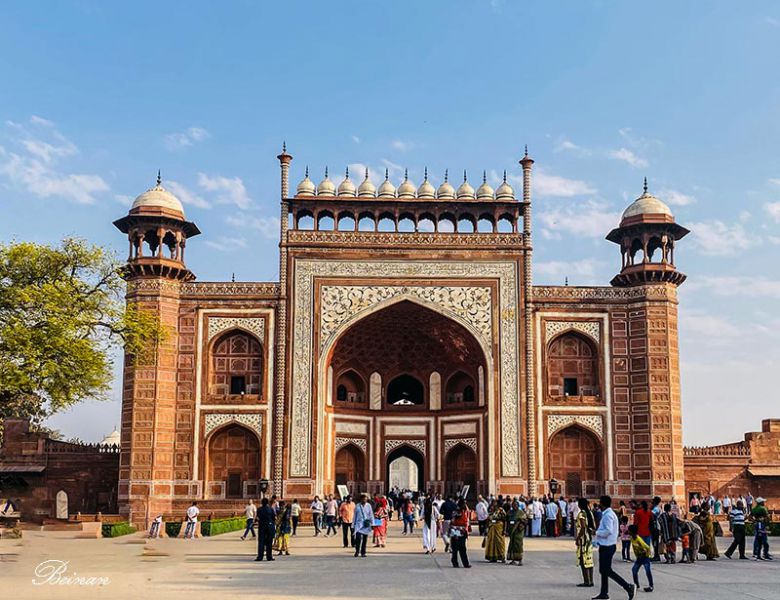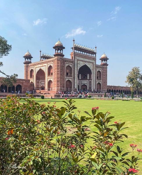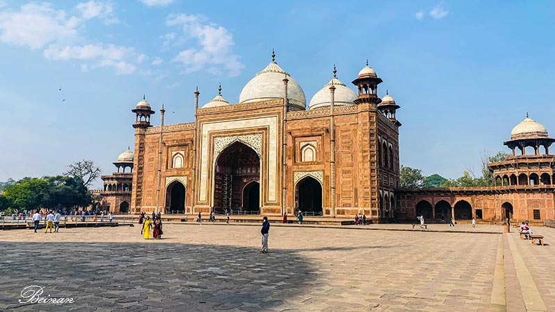 还没有看到泰姬陵,已经被这个大门(Great Gate / Darwaza-i rauza)的气势镇住。这个大门是陵墓的主要入口。它由红砂岩制成,并饰有错综复杂的白色大理石镶嵌物。大门的装饰富丽堂皇,上面雕刻着花卉或植物图案,还有用精美的书法篆刻的古兰经经文。
