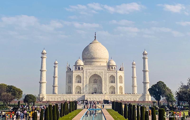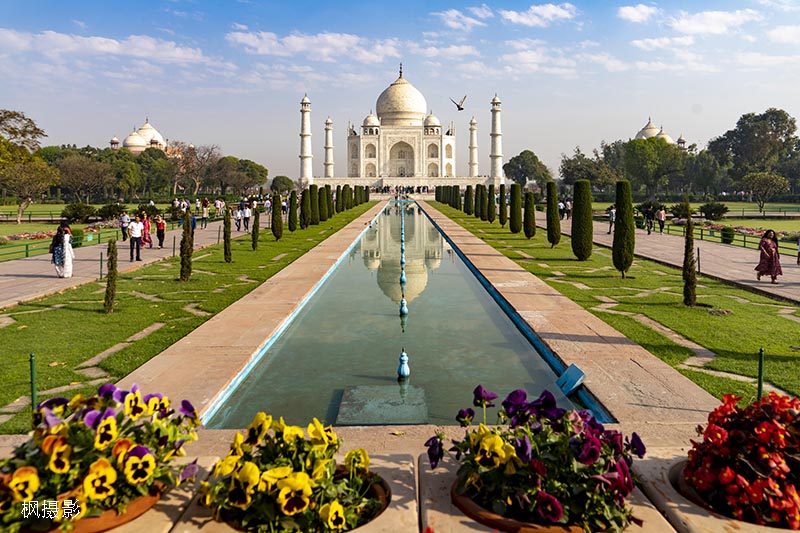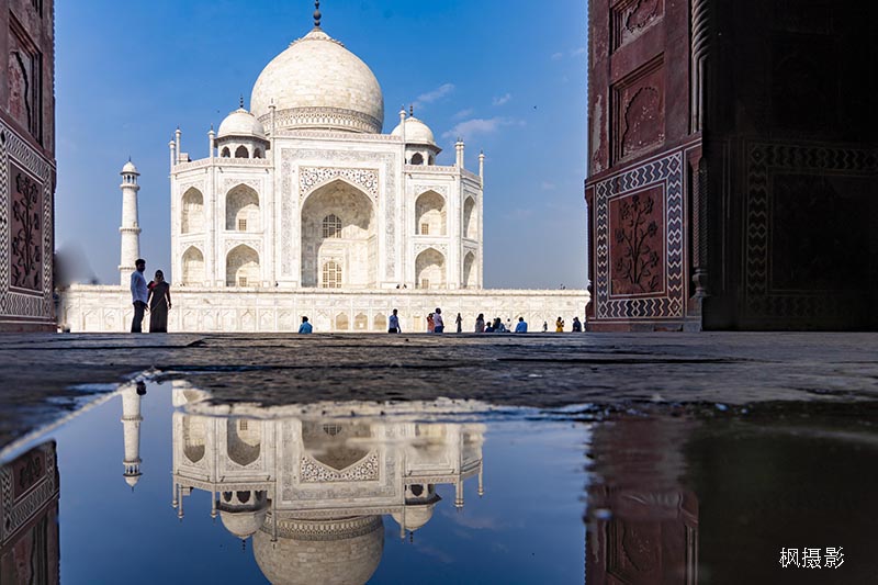 泰姬陵的前面是一条清澈的水道,水道两旁是成排的柏树,分别象征生命和死亡。