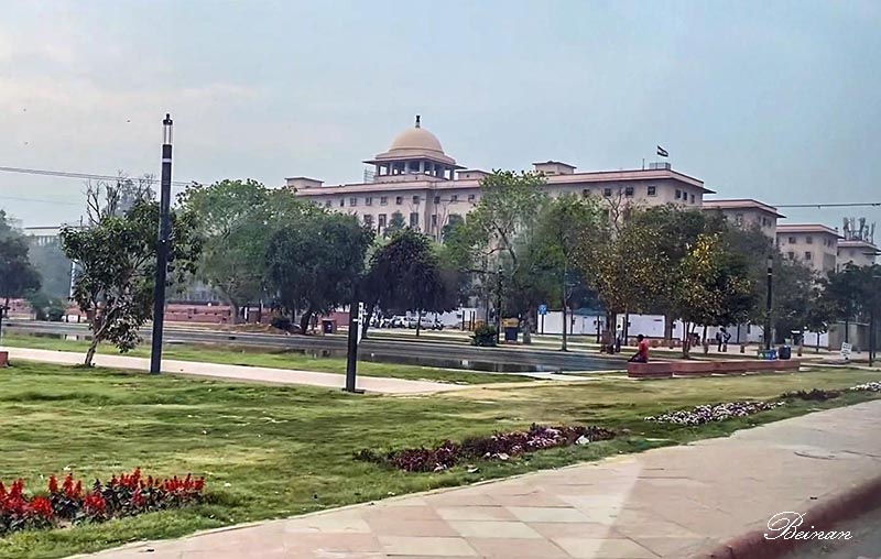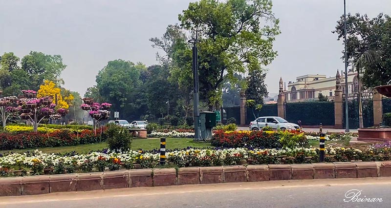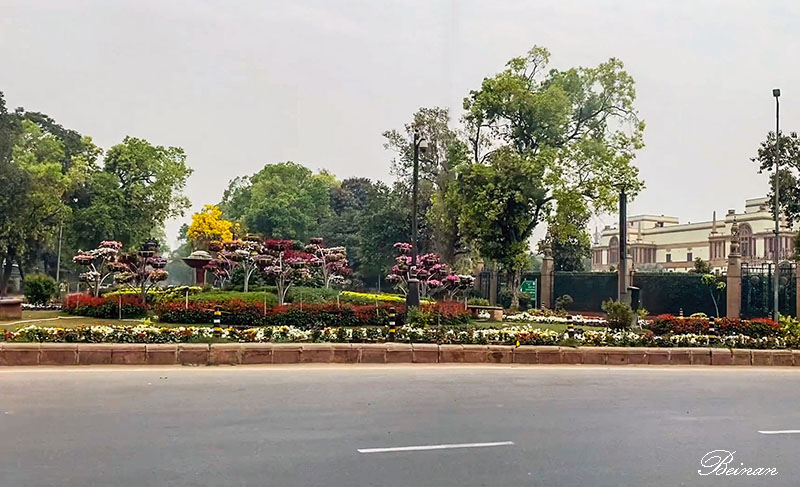 路过印度政府商务部和工业部的办公楼。路边是漂亮整洁的街心花园。