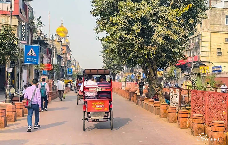 这座耆那教寺庙在古老的月光集市(Chandni Chowk)大街上。这是老德里的主要街道。导游帮我们叫了人力车,开始了我们的人力车老城游(Rickshaw Ride)。这是到德里观光的一个重要项目。其实这就和北京的三轮车一样的啦。
