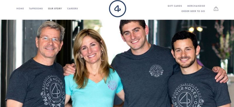 关于我们:“2008年的金秋,恰逢老爸50寿辰把咱们一家4口(那时我还单身)带向爱尔兰。在一家昏暗的酒吧(Pub)里,咱们4个大鼻子集体行动:吸嗅陶醉于杰尼斯啤酒(Guinness Beer)的浓郁香味中。好友注意到咱们4个繁忙的施诺兹鼻子(Busy Schnozzes),带给我们灵感:把我们对啤酒的爱与激情(love and passion)带到科罗拉多小镇,用我们的特征(signature feature)作品牌。4鼻啤酒公司由此而来。。。”