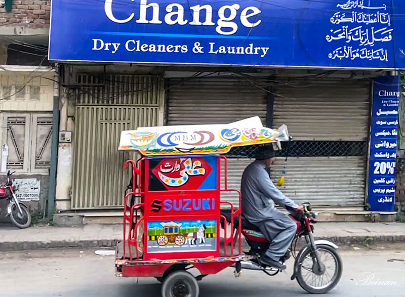大街上,可以看到很多英语招牌。因为英语和乌尔都语(Urdu)都是巴基斯坦的官方语言。乌尔都语是巴基斯坦的国语和通用语言,而英语则多用于政府机构,商业交流,及学校等。不过,巴基斯坦人说的英语可比印度人说的英语好懂多了。