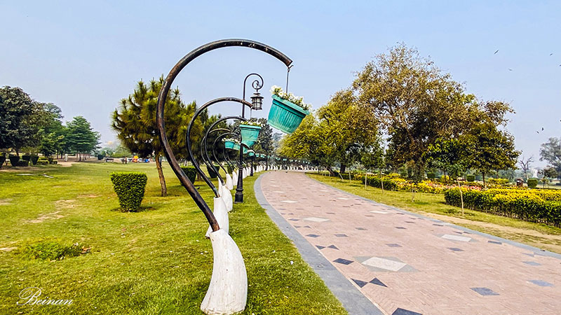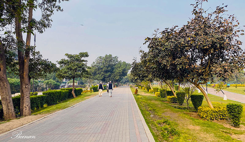 这个公园也是拉合尔的一个著名地标。早上人不多,很清净舒适。石砖步道旁有一排望不到头的吊着花盆的铁钩,优美的线条,很是好看。