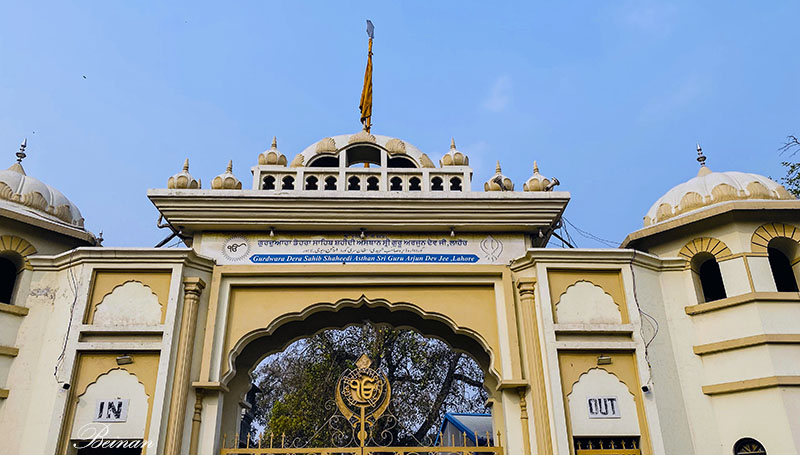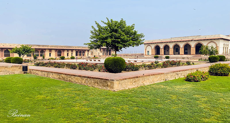 从拉合尔堡的庭院里,可以清晰地看到附近的巴德夏希清真寺 (Badshahi Mosque,左)和德拉·撒西比谒师所(Gurdwara Dera Sahib,右)。