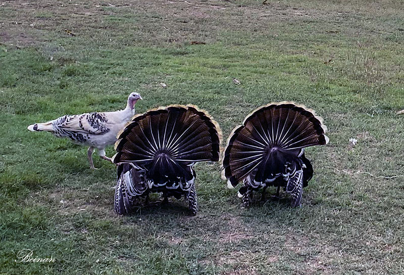 正好看见旁边草坪上两只正在翘尾巴的火鸡,它们的尾巴和游骑兵帽子上的扇子好像哦。没准儿那帽子设计的灵感就是从这儿来的。