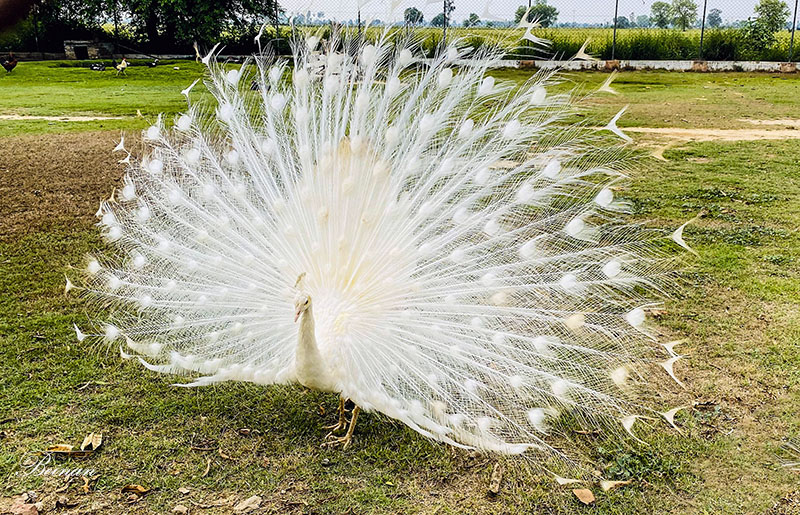 路边院子里有一只美丽的白孔雀,得意洋洋地向我们展示自己的羽毛的美丽。好像在说,不要看降旗仪式了,就在这里看我吧!