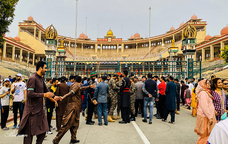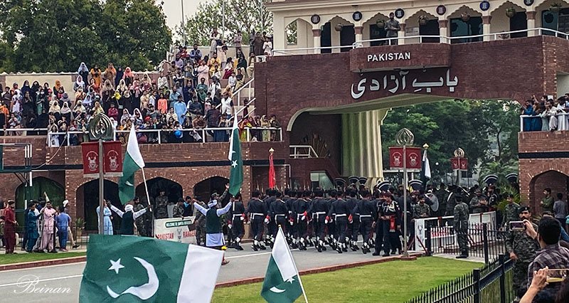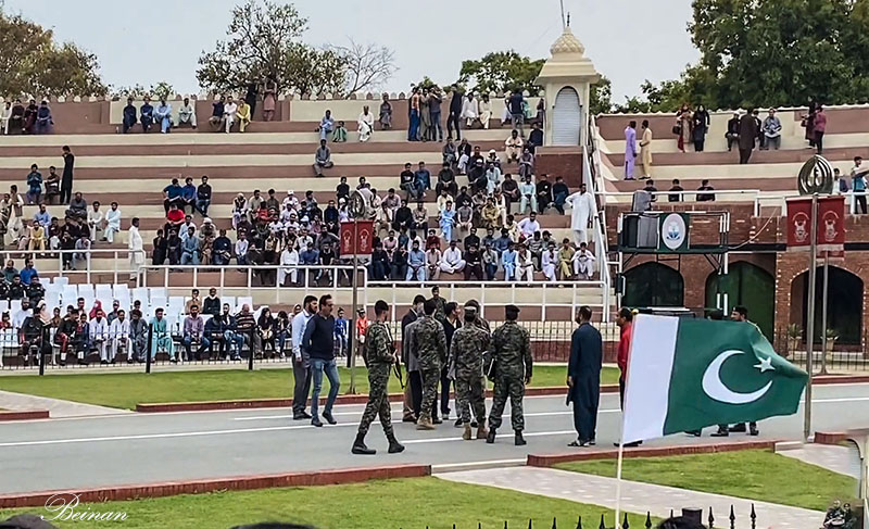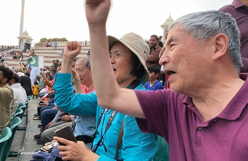 别看巴基斯坦这边人少,气势不次于印度那边。因为我们都帮着高声呐喊,跟着广播里的指挥,高呼“Pakistan(巴基斯坦)! Pakistan!”。也不知喊的是“巴基斯坦万岁”还是“什么什么巴基斯坦”。看着朋友们都在振臂高呼,特别是王大明白,录视频时嘴里还跟着喊,我再次笑疯。