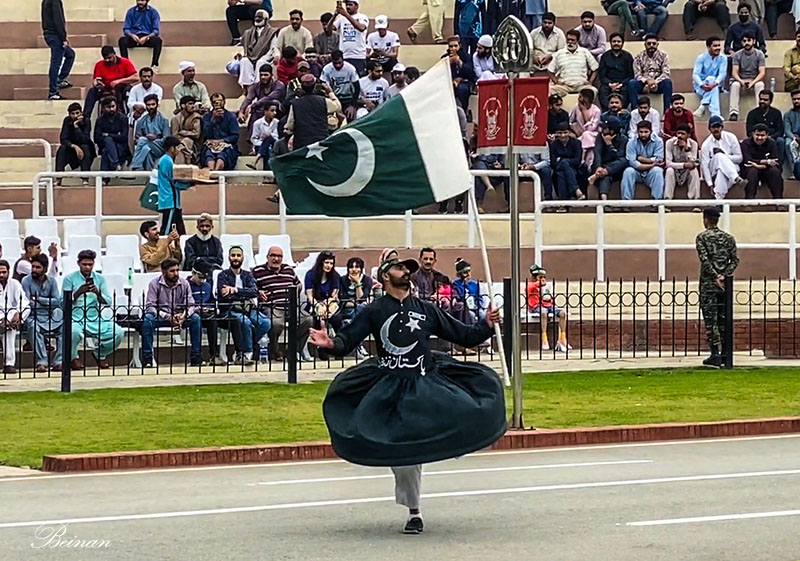一个人举着巴基斯坦国旗在场地中间转圈儿,其实那天在印度那边就看到了这个转圈人。这次才清楚地看到,他只有一条腿,一直是在用一条腿在转。不知道他是不是在战争中失掉一条腿的。1947年巴基斯坦独立后,和印度的战争不断,国家状况很不安定。当然,受害的都是老百姓。