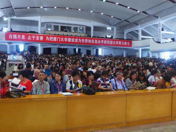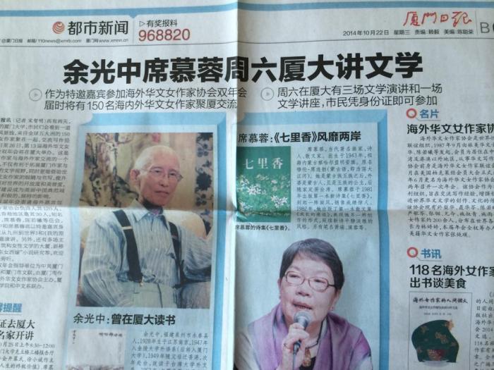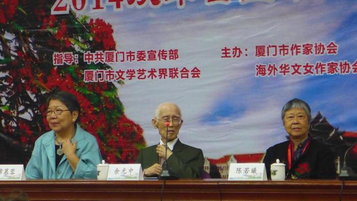 这次2014年的双年会,在中国的厦门和台湾的金门分别举行的,厦门选在厦门大学,金门选在金门大学,总的来讲厦大的规模比较大也比较正式,协会请来了两位著名的台湾诗人:余光中和席慕蓉,在厦门的开幕仪式上,我们还见到了中国著名的朦胧诗代表诗人:舒婷。