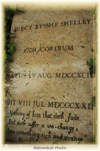 我驻足在雪莱躺在地上的墓碑前,注视着这朵永不凋谢天堂之花。我相信,从那一天起,正如这墓碑上所宣告的一样,海再也无力向他的灵魂发威,经过海的苦痛,他已成为更绚烂更奇异更美妙的丰富。