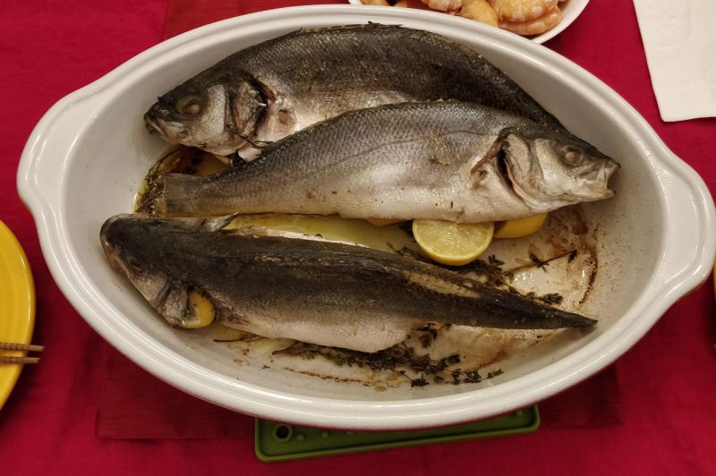 这是考试特抠(COSTCO)买的欧洲海鲈鱼(Branzino),超鲜美,好吃。欧洲海鲈鱼超大个子,咱们一大家子,一条鱼都没吃完。正好讨个吉利:年年有鱼(余)。
