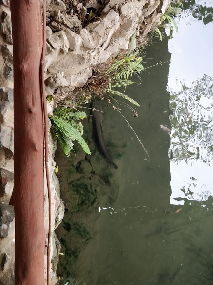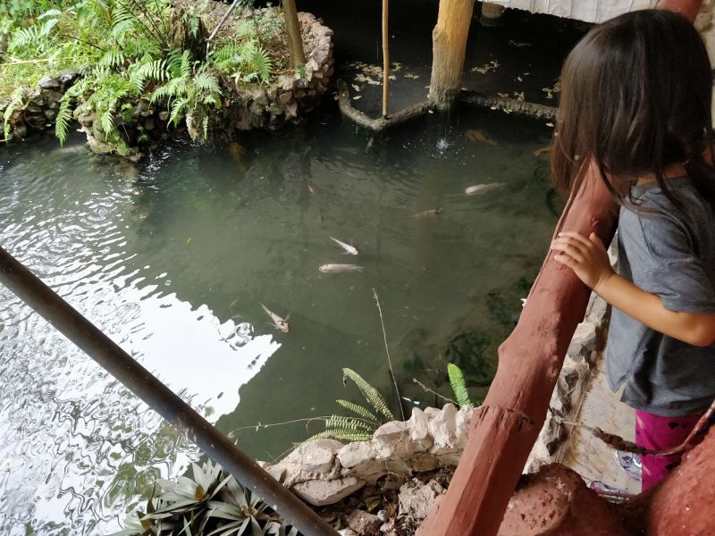 等着上菜,发现院里的水池养着很多鱼。带孙女、孙子看鱼: