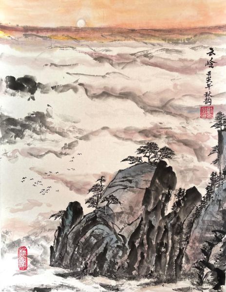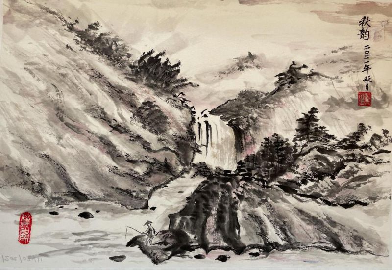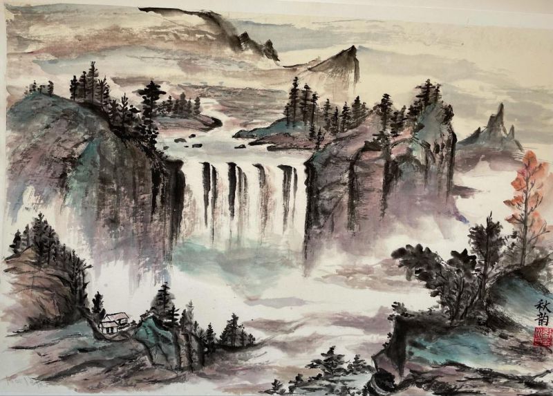 秋韵今日《七绝 上善若水》(藏头),题她的山水画‘美术史研究人说,东方山水画与西方教堂画,都是源于人对神、对大自然的敬畏’。次韵唱和,也藏头。
