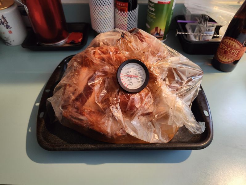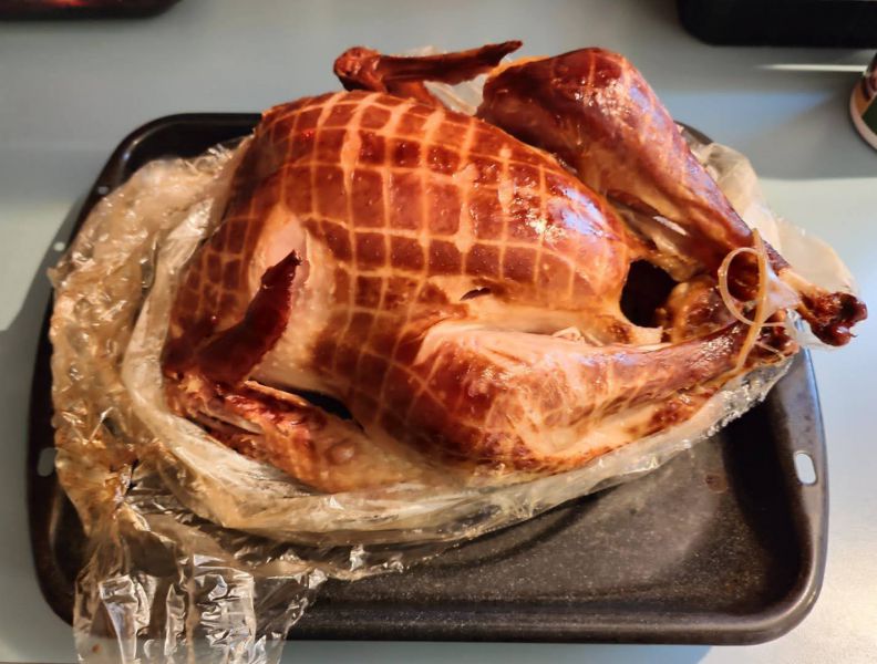 烟熏火鸡烤箱里350度(华氏)烤2个小时,热乎乎的出炉(要求华氏145度以上):