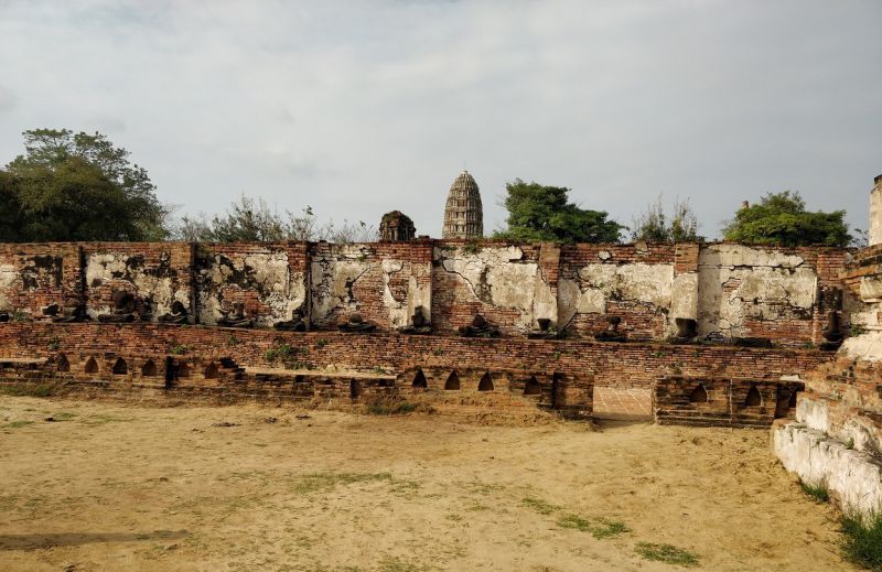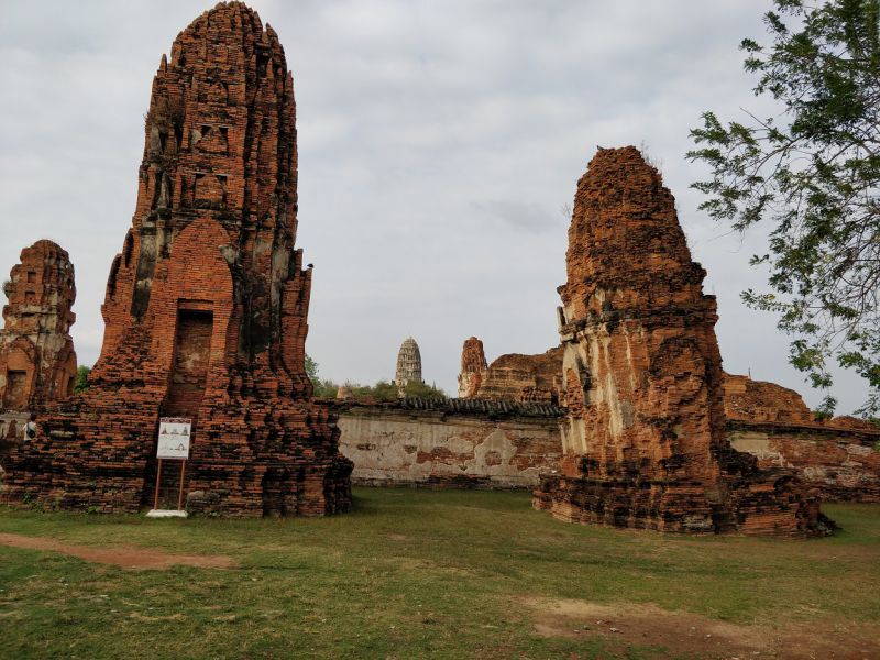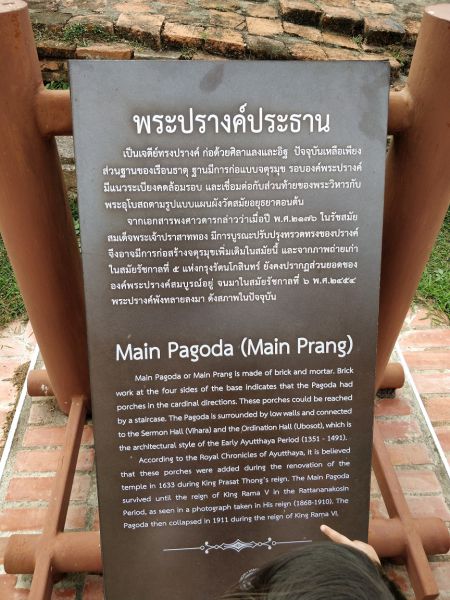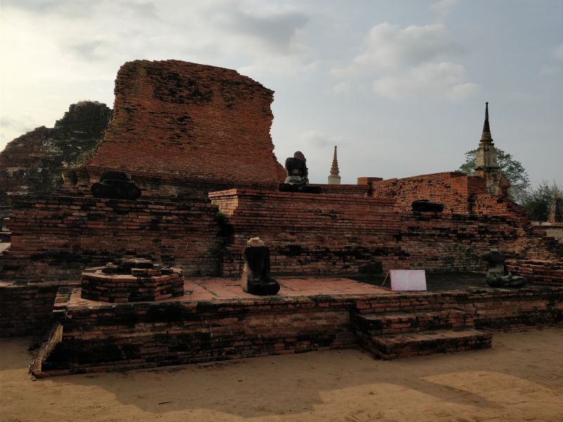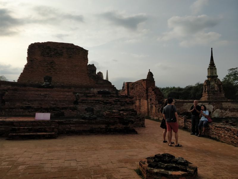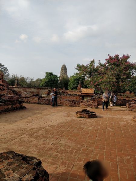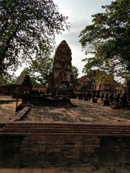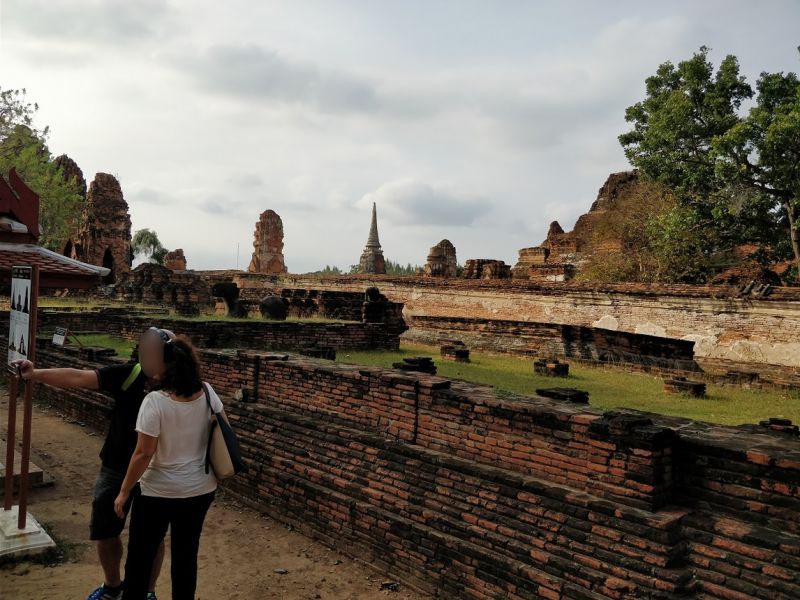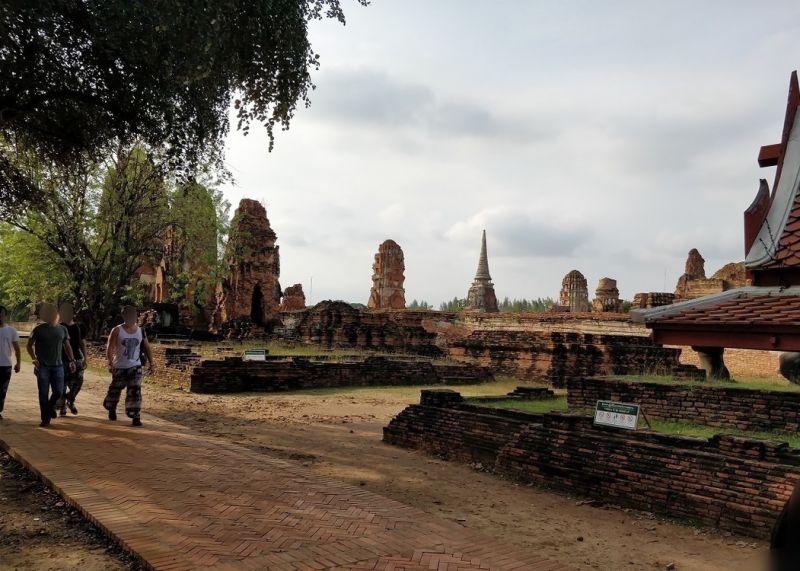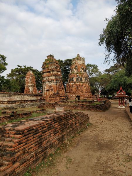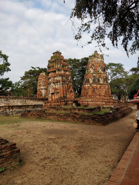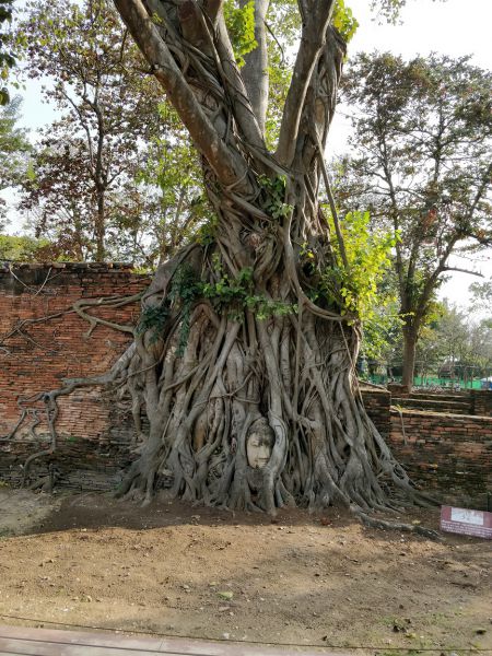 问度娘:“玛哈泰寺(Wat Mahathat)位于泰国最古老的都城阿瑜陀耶古城的中央,是该城的中心。佛寺四面有沟渠环绕,从印拉第王开始建造,直到1345年完成于李泰王时期。属于皇室宗庙。寺中原有209 座塔,10处僧院,但大部份都仅剩地基而已。寺内有中央塔台,四周是有四面佛龛的小佛塔和庙堂样式的佛塔。中央佛塔使用红土建成,再涂灰泥粉饰。莲花花蕾状顶端佛塔被称为素可泰式,不同于其他国家的佛塔。”