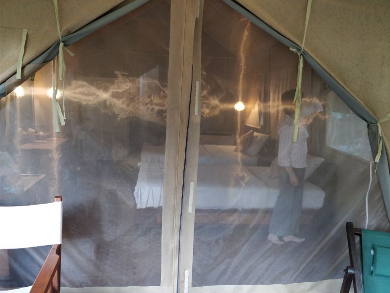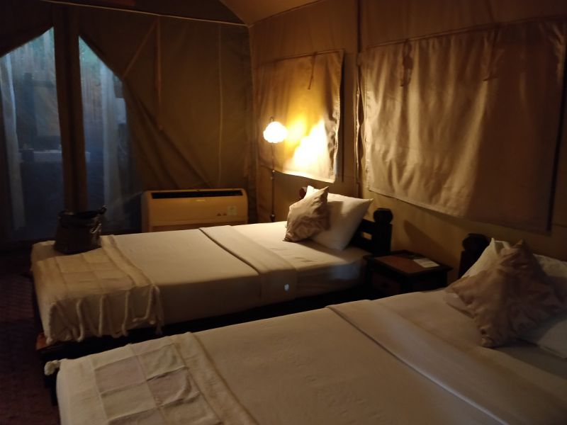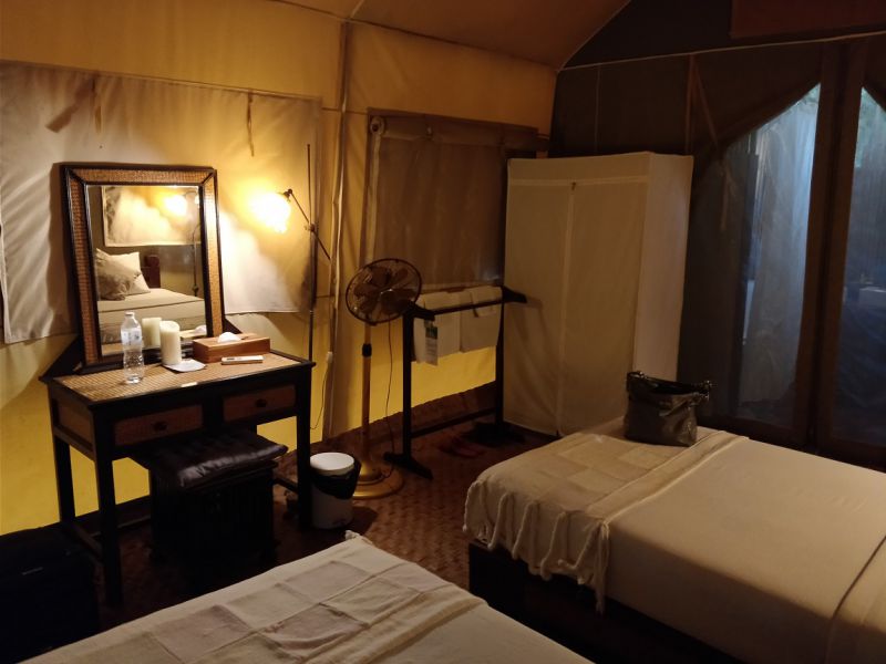 我们却是懒惰又要享受型的,住帐篷有点儿乖乖龙帝冬。不过至少有小床(虽然不太结实)、有电灯: