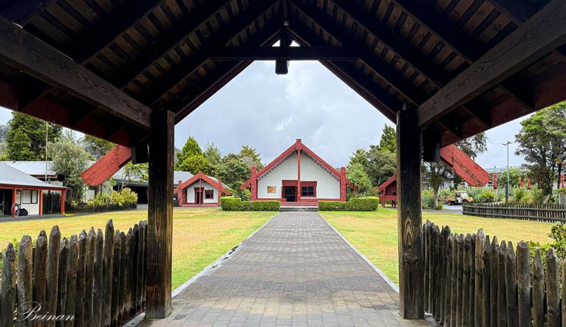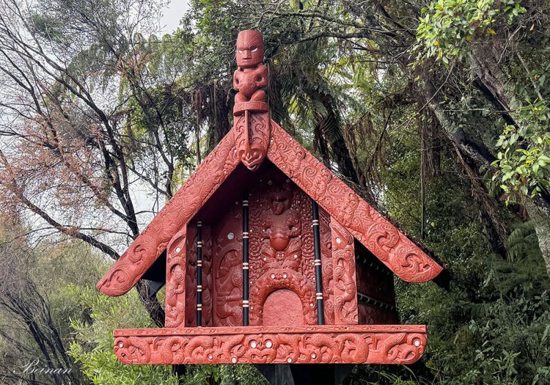 毛利会堂(Marae) 是毛利人最重要的社会与文化中心,既是一个神圣的集会场所,也是维系族群、家族和部落身份的核心。它由一片开阔的广场和一座雕刻精美的会议屋组成,会议屋象征着祖先的身体,屋顶是脊背,横梁是手臂,正门是心口。