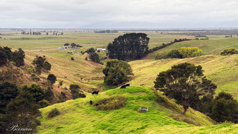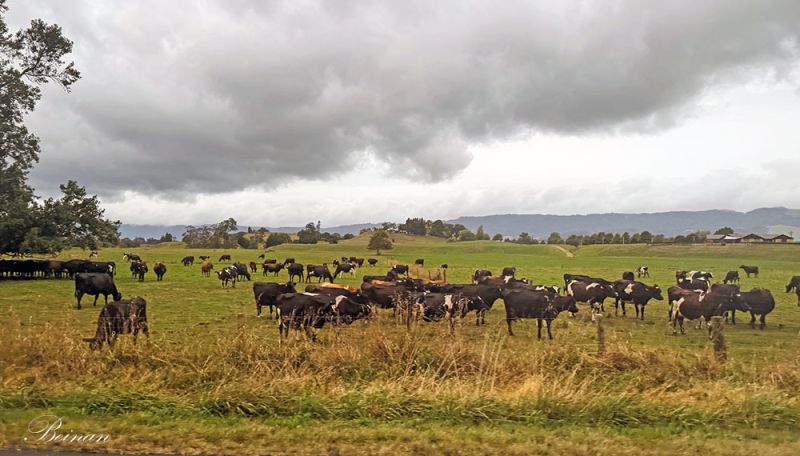 远处,可以看到遍布山丘与牧场的牛群。这是在新西兰最常见的景观。