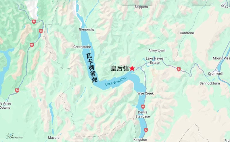 皇后镇的瓦卡蒂普湖是新西兰第三大湖,全长约80公里。开始我还以为是条大河,仔细看了地图才搞明白,这是一个呈闪电形的大湖。图中红星的位置就是我们的公寓。
