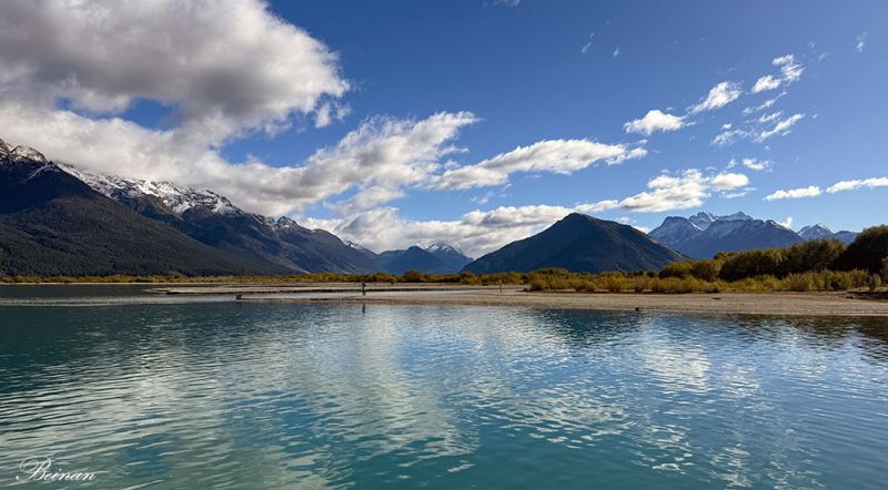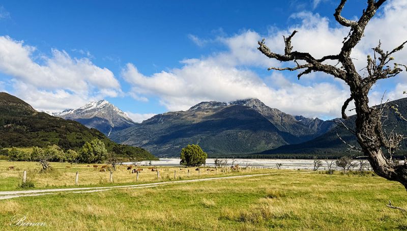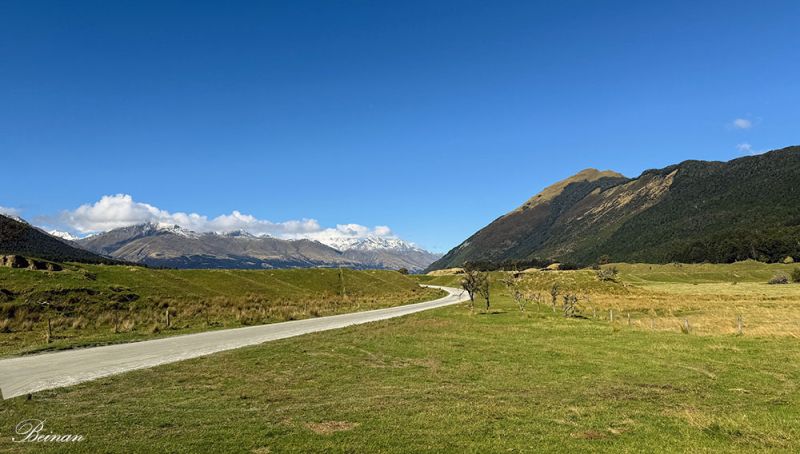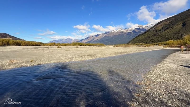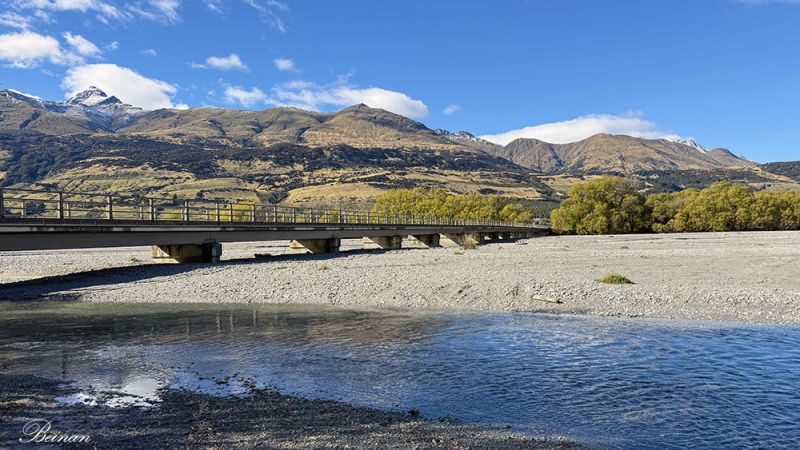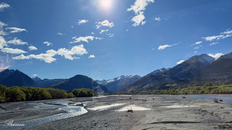 面前是一条巨大的冲积平原,里斯河(Rees River)在宽阔的河床上分流成无数条银色的水带,闪闪发光。四周群山环绕,远处白雪覆盖的厄恩斯劳山 (Mount Earnslaw)像一位巨人般矗立。