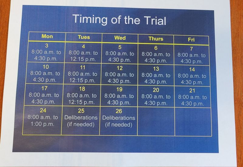 庭审时间从3月3日(星期一)到3月24日(星期一),共三周加一天。