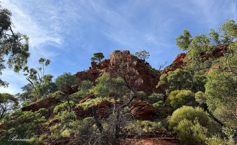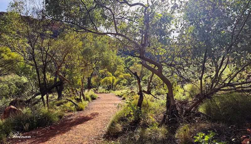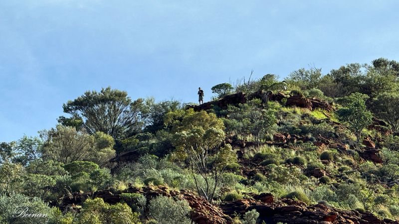 在峡谷里,一边走,导游一边讲故事。他告诉我们,这个瓦塔卡国家公园所在的地区是卢里贾族(Luritja)原住民的传统领地,已有数千年的居住与神话传说。“Watarrka” 一词在卢里贾语中指一种当地树种——相思树(Acacia ligulata)。他指给我们看这种树,但老太也没记住。这里有太多的树木老太从没见过。