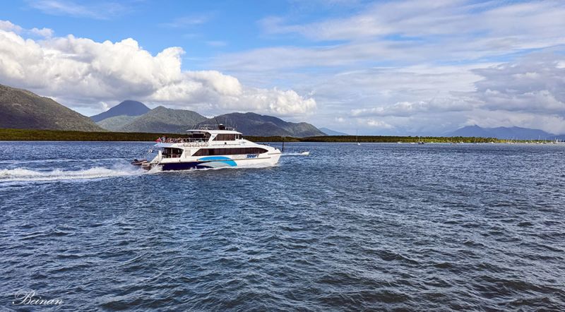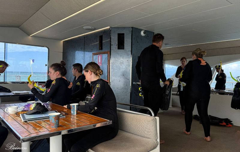 果然,刚离开凯恩斯港不久,海面就开始起伏。双体船虽然比普通船稳,但浪一大,仍能感到船体在上下摇晃。虽然吃了晕船药,但是吃晚了,还是有些晕船。