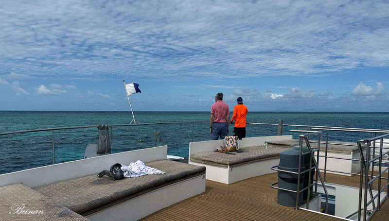 上船时,有人在门口发脚蹼,我们没要,说不下水,那人还挺奇怪----不下水你们来干啥?我们也没在意。但是现在看到船上的人都下水了,空荡荡的船上只有我们俩老头老太和工作人员,开始怀疑人生了----难道我定错了船?