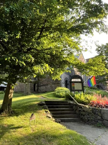 古老教堂三百年 貌似城堡光影衍 彩虹飘扬宽容舞 一神多元教绵延