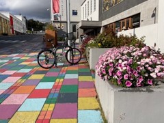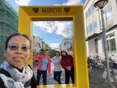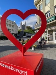 早晨在阿克雷里镇上散步, 红心前遇到从乌克兰来留学的几个年前学生,说有功课要和游人打招呼并合影,大家一起拍照还开心。在小镇上逛逛,峡湾里有游船,这里从雷克雅未克开车过来只不过4小时三刻钟,或者乘飞机或游轮都是美好的经历。