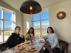 去小猪超市买鸡翅,鸡肉,鱼儿掌勺,阿碧切肉,若谷洗菜,刚站稳,被韩国美眉叫去,她晚来了一会儿,没找到工作人员,电话又打不同,借电话一用,还好一打就通,三言两语解决问题,她们拿到房门钥匙。若谷接着回去洗东西。虽然开火费了一番周折,换了个炉子很快鱼儿开始大显身手。另一波中国游客过来鼓捣那个炉子无望,不久韩国游客过来娴熟地打开炉火,烧起了五花肉。晚饭有美味可口可乐鸡翅,茄子炖鸡肉,西红柿,方便面, 鱼儿的手艺给人带来的岂止是味觉享受?韩国游客们吃的是生菜卷五花肉。另一桌的中国游客们有烤肉吃。其余各桌的游客各自入座,不拘吃喝,大家其乐融融。