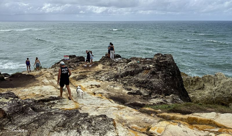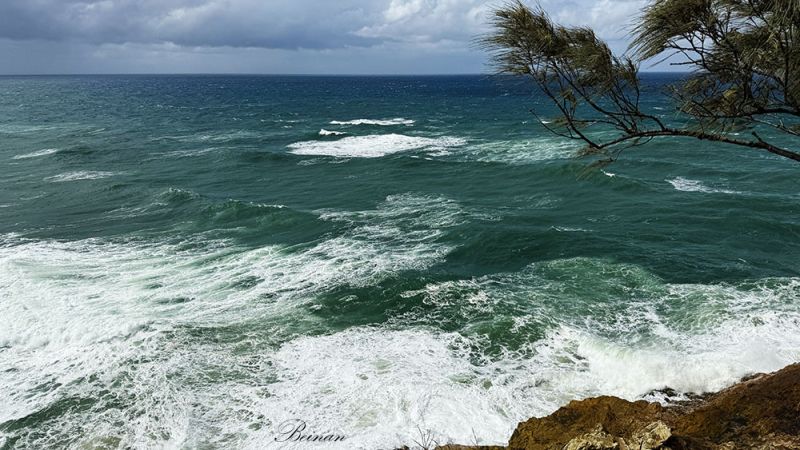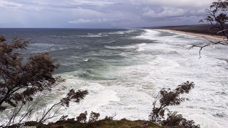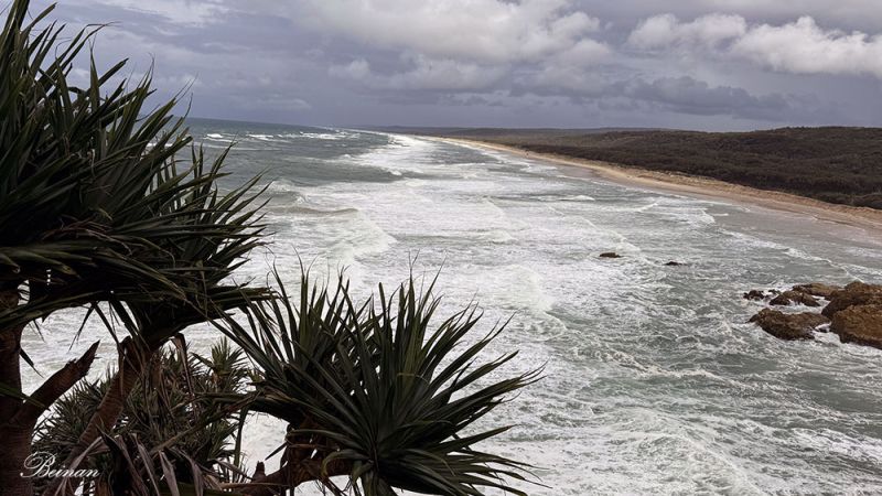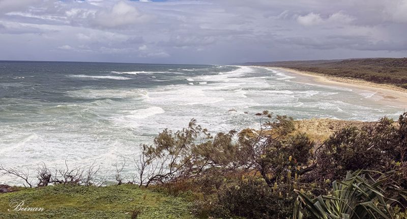 站在瞭望角(Point Lookout)上,太平洋在脚下无边无际地展开。海面一层层起伏,白浪闪耀着银光,从远处整齐地推进,一排又一排地拍向金色的沙滩。浪花在岸边翻滚成白色的泡沫,风裹着海盐的气息呼啸而来,带着微微的凉意。