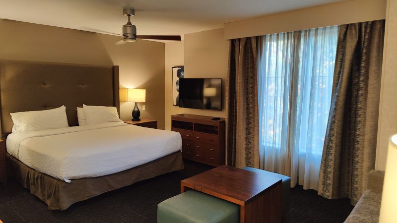 我选了希尔顿旗下的Homewood Suites 套房旅馆,在欢乐山庄市(Pleasant Hill)。套房带厨房,有大冰箱、洗碗机等一应咚咚。自己房内有用餐区(dinind area),还可以小酒。停车费每天7刀(一辆车),应该也是保险负责。