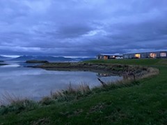 六点多开始看到不远处的冰川。霍芬小镇位于冰岛东南部,坐落在欧洲最大的冰川瓦特纳冰川附近,邻近霍尔纳泻湖。 以出产高品质的海螯虾(冰岛龙虾)而闻名,镇上有多家龙虾餐厅和冰河博物馆。 虽然前台推荐了小镇上最好的海鲜餐厅,大家一直决定在旅馆餐厅吃饭,晚饭是鱼儿和阿碧全权决定的,有龙虾意大利面,比萨饼,肉和色拉,龙虾不大,分三份,若谷吃肉就足够了。饭后快九点了,外面还没黑透,照相也不错,旅馆外面可以徒步或骑车,海湾里的小岛多多,远处十多个冰川联袂如画卷在夜色中含情脉脉。