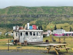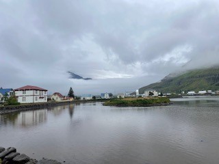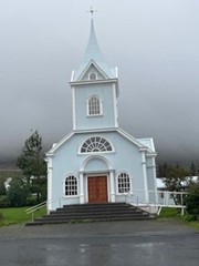 斯托瓦菲厄泽(Stöðvarfjörður):一个沿海小村庄,坐落在以其名字命名的峡湾北侧。村子人口约200人。曾主要依靠冰岛东部繁荣的渔场,但与许多小村庄一样,随着20世纪70年代现代渔业改革席卷全国,渔场的繁荣开始衰落。如今,该村的经济主要依靠纺织业和旅游业。佩特拉石头收藏(petra's stone collection)就是其中一个景点,每年吸引着众多游客来到这个偏远的沿海村庄。车停到佩特拉对面的水边上,没去看石头,吃了自带的可乐鸡翅,径直朝山坡上的蓝色教堂走去。山坡上面的游人显然比下面多。虽然不是晴天,但景色甚佳。