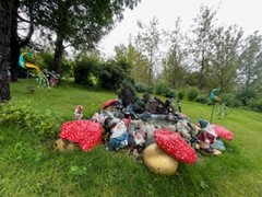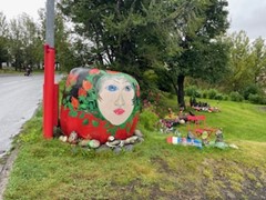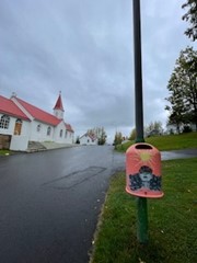回到那家门前有人面像的院子,依然没有合适的停车位,雪儿把车停到对面路边上以防影响交通。先是站在路边拍照,越走里房门越近。房门前有几双鞋,大家猜测这家是民宿。碰巧男主人从后院走过来打招呼,若谷问是谁设计的院子这么漂亮,他说是女主人,话音未落就回头用冰岛语叫他太太,几分钟后出来一个面色红润,手上衣服上都有油墨的女士,她的英语不是那么流利,但不影响交流。原来她门前的鞋子是孩子们的,女儿就住本村,她也是土生土长的居民,平时超级喜欢画画,一画起来就玩了时间。自己的作品不拿来卖,只在家里展示,院子里的陈设也都是她一点点设计的,嘱咐不要把她放网上,其余的随便拍照,人面像的里面是草个子,还说常有游客在这里驻足观摩。心思奇巧的她把生活过成了童话,一个普通的家庭主妇却给来自世界各地的游客带来了非凡的享受。